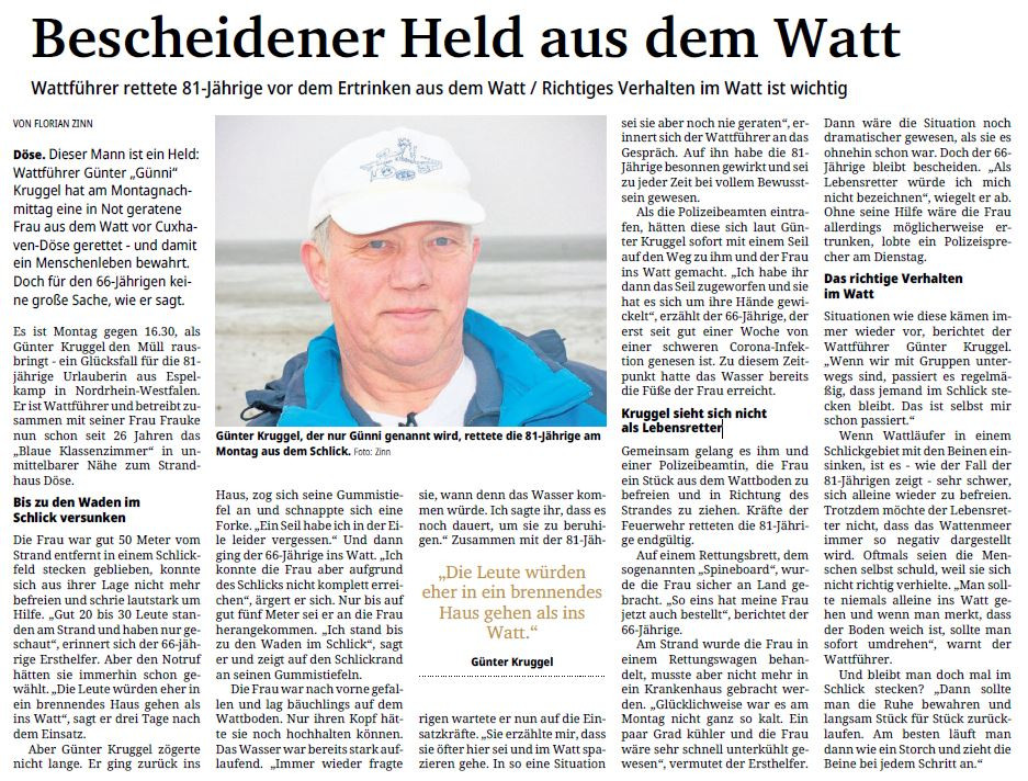 Dieser Mann ist ein Held: Wattführer Günter "Günni" Kruggel hat am Montagnachmittag eine in Not geratene Frau aus dem Watt in Cuxhaven-Döse gerettet - und damit ein...