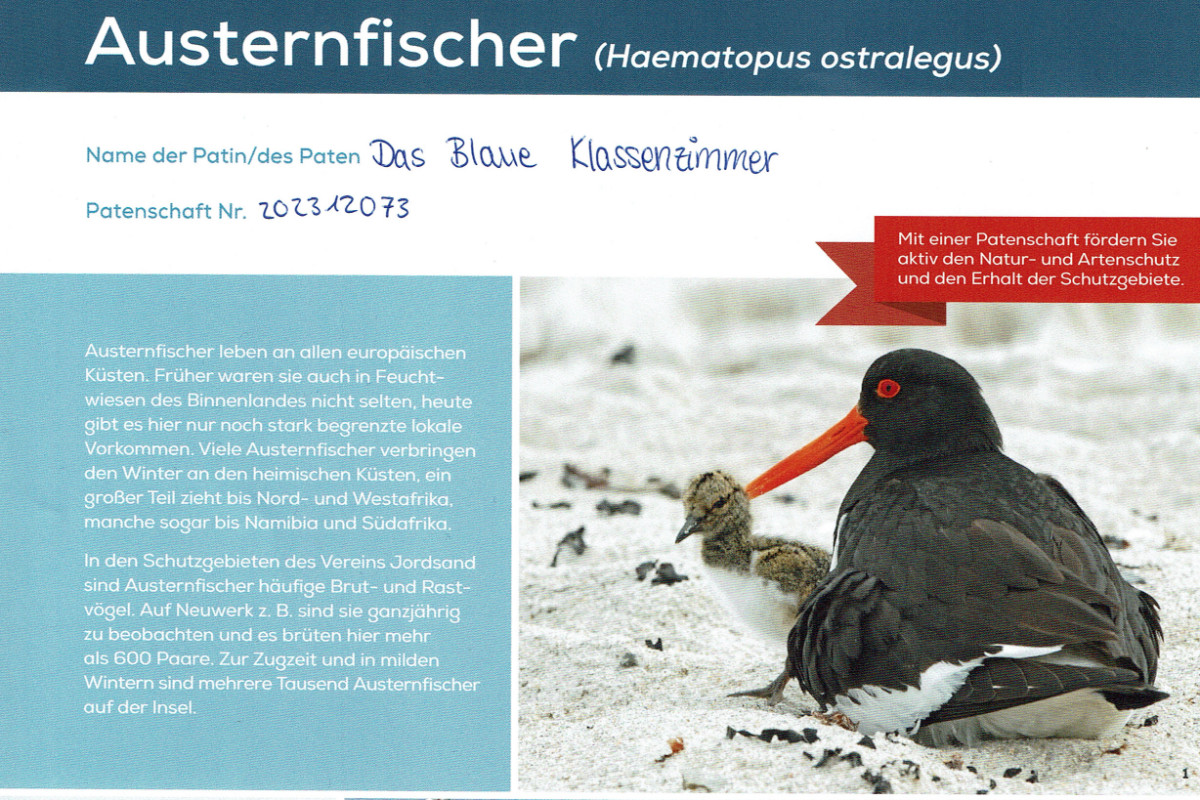 Das Blaue Klassenzimmer hat die Patenschaft für einen Austernfischer übernommen. Unter der Nummer 202312073 ist die Patenschaft beim Verein Jordsand in Cuxhaven registriert. Auf...
